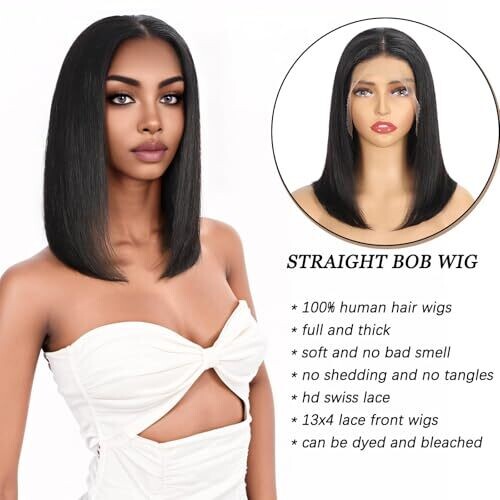 • Brazilian Human Hair Straight Bob Wig with 13X4 Lace Front, 100% Unprocessed