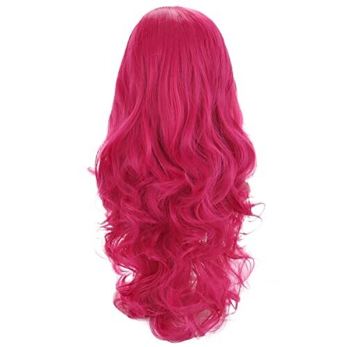 • Vibrant hot pink long wavy wig with bangs, designed for women.