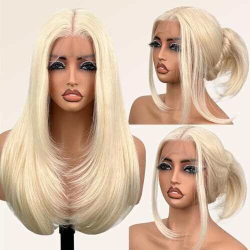 • Glueless synthetic front wig designed for daily wear, work, school, and travel, 26 inches long in a straight black style.