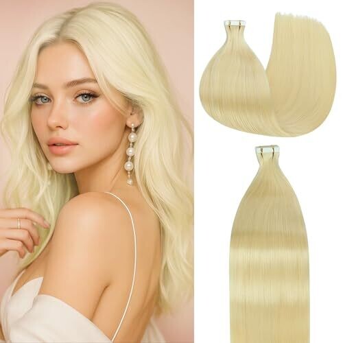 Get instant volume and length with 18-inch platinum blonde Remy hair extensions. Skin weft with double-sided invisible tape for a flat, secure blend that pairs with cool blonde tones. Twenty pieces provide natural fullness and a salon-quality finish with easy application and removal.